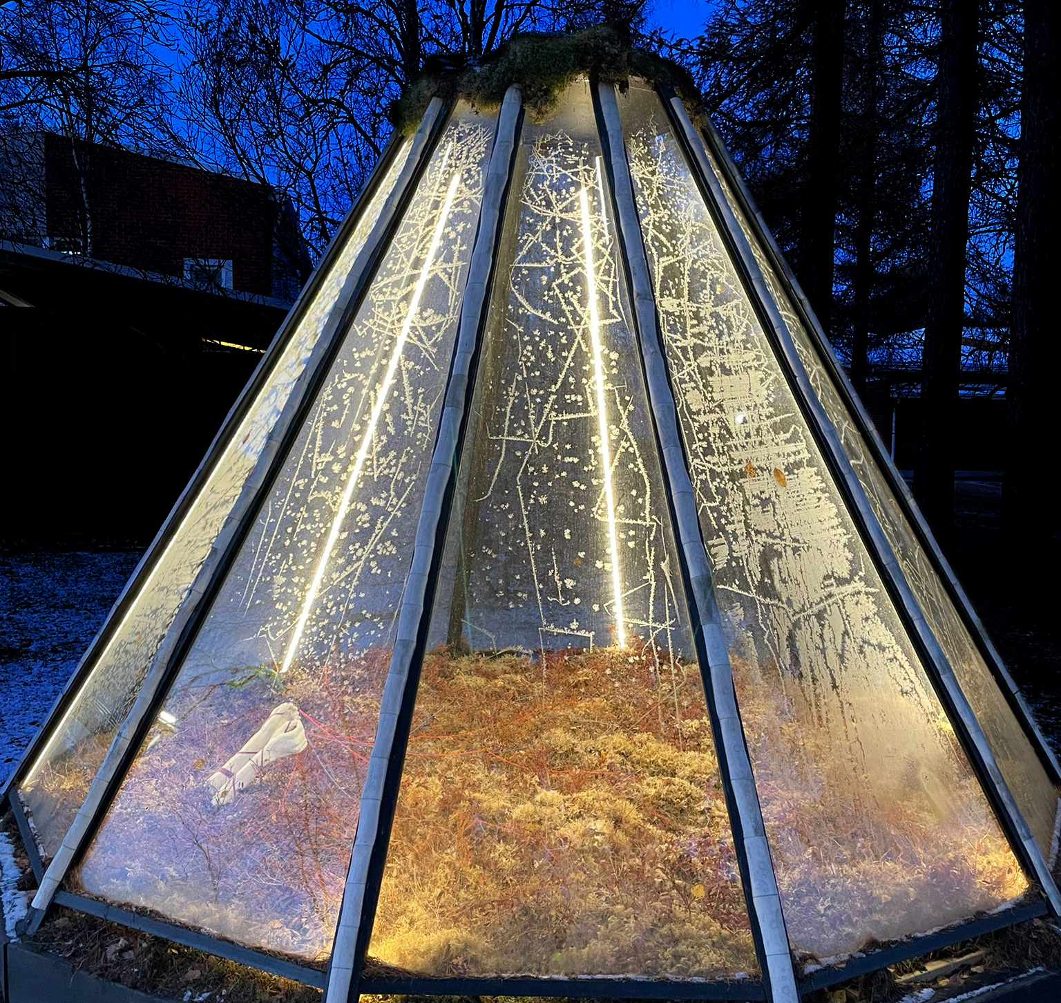 Guldalit, Čatnasit, Ciekkadit (2023) is an environmental and spatial art work in which Stina Aletta Aikio combines more or less processed natural materials with a lávvu belonging to the iconic Sámi imagery. The work’s showcase-like structure considers issues of presentation and being on display. Glass as an element plays a central role in the work. Glass protects what is placed behind it, but it also isolates it from the viewer, preventing touching, hearing and communication/interaction based on them. The showcase freezes the reciprocal relationship of humans with the land and other living things, which requires listening to be established in order to create relationships. The same freeze can govern more broadly how the Sámi are presented and seen – or remain unseen and unheard.